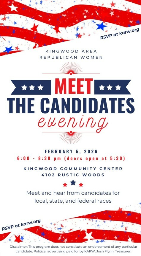 DISCLAIMER: Political advertising paid for by Kingwood Area Republican Women Josh Flynn, PAC Treasurer, P.O. Box 431158, Houston, TX 77243. Contributions are not federal tax deductible as charitable contributions. Corporate contributions are not permitted.